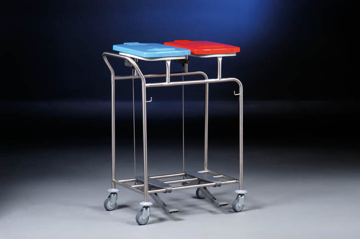 Podwójny zbieracz prania, z 2 opatentowanymi obręczami HR 2000 do zamocowania worków (obręcz wyposażona jest w kołnierz gumowy zawijany do góry, dzięki czemu worek nie zsuwa się z obręczy, aby zdjąć worek ze zbieracza wystarczy pociągnąć brzeg worka do dołu), z wytrzymałymi pokrywami wykonanymi z ABS, otwieranymi za pomocą mechanizmu pedału, dostępne kolory pokryw: biały, żółty, czerwony, zielony, niebieski, brązowy, szary, czarny, konstrukcja zbieracza wykonana ze stali nierdzewnej, solidnie spawana, pozbawiona śrub i ostrych krawędzi, dodatkowy haczyk stalowy, 4 kółka obrotowe o średnicy 75 mm ze zderzakami w formie krążków, dostępne również inne kółka, wymiary: 750 x 495 x 950 mm (szer./gł./wys.), dostępna również wyjmowana dolna półka z ABS w kolorze jasnoszarym zabezpieczająca podłogi przed zabrudzeniem