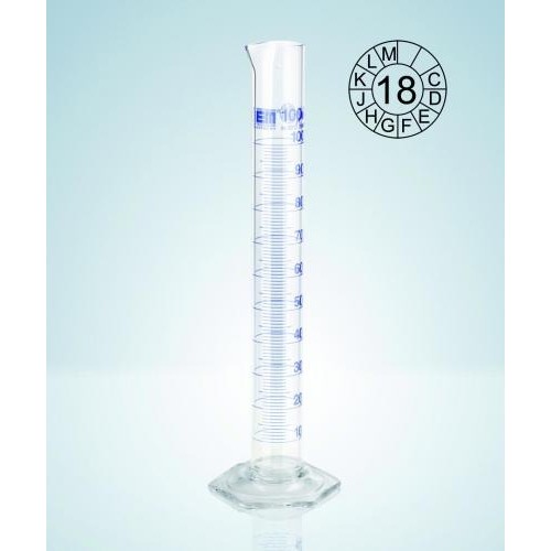 Wzorcowane na wlew (TC, IN). Podziałka i napisy wykonane trwałą, niebieską, emalią, zgodnie z normą DIN EN ISO 4788. Główne punkty podziałki w formie pierścieni. Hirschmann Z wylewem, sześciokątną, szklaną stopką i nadrukowanym oznaczeniem serii i rokiem produkcji. Certyfikat zgodności wg DIN 12600. Raport kalibracji serii dostępny na stronie producenta www.hirschmannlab.com. Indywidualny certyfikat kalibracji lub certyfikat DAkkS (dawny DKD) dostępny na życzenie.