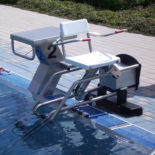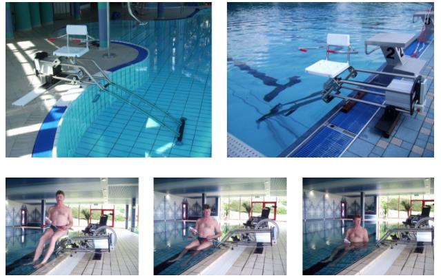 - Użytkownik przesuwa krzesło na brzeg i ukośnie do basenu, co ułatwia wsiadanie, kiedy znajduje już się na nim użytkownik następuje przesuwanie się krzesła w głąb basenu.