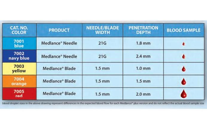 Nakłuwacz jednorazowy Medlance® jest używany do uzyskiwania próbek krwi stosowanych w różnego rodzaju testach diagnostycznych, przede wszystkim w badaniach poziomu glukozy oraz cholesterolu. Nakłuwacze Medlance® przeznaczone są do użytku laboratoryjnego zapewniając najwyższy poziom bezpieczeństwa zarówno dla pacjentów, jak i personelu medycznego. Specjalnie szlifowane ostrze z nierdzewnej stali oraz szybkość nakłucia minimalizują ból. Polecany szczególnie dzieciom narażonym na wielokrotne nakłucia i reagującym stresem na widok igły. Zarówno igła, jak też moment nakłucia jest niezauważalny.