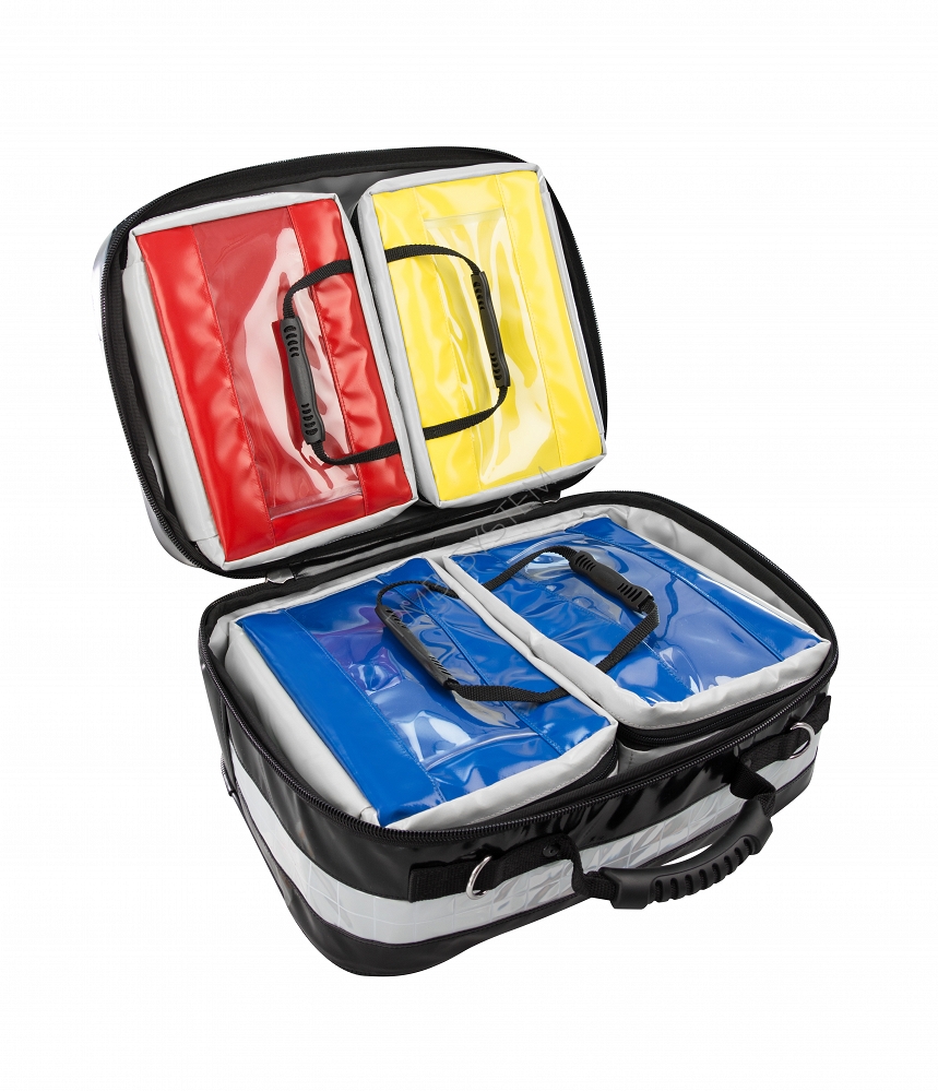 Saszetki segregacyjne kolorystycznie dopasowane do grup funkcyjnych. Części wyposażenia takie jak sól fizjologiczna, opatrunki hydrożelowe, nożyczki oraz sterylne i nie sterylne materiały znajudją swoje miejsce w kolorowych saszetkach segregacyjnych.