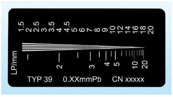 Ołowiany (grubość od 0,1 do 0,3 [mm]) wzorzec rozdzielczości przestrzennej, zamknięty w PMMA.