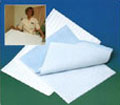 Wzmocnione prześcieradło w kolorze białym w niebieskie paski, wykonane z chłonnej celulozy laminowanej folią.