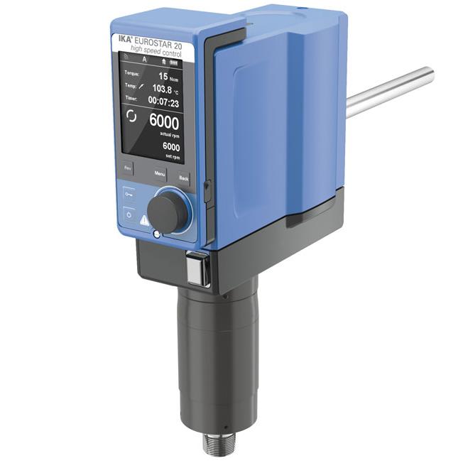 Mieszadła laboratoryjne ze zdejmowanym, bezprzewodowym kontrolerem i wyświetlaczem TFT. Z automatyczną, mikroprocesorową kontrolą prędkości w zakresie 0/150 do 6000 obr./min. Wyposażone w złącza RS 232 i USB pozwalające na kontrolowanie i dokumentację procesu oraz upgrade oprogramowania. Wyświetlana wartość momentu obrotowego pozwala śledzić zmiany lepkości. Dołączony pręt z końcówką mieszającą posiada długość 280 mm i maks. głębokość zanurzenia 220 mm.