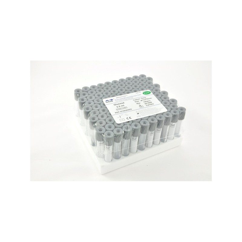 Dostępne są z różnymi dodatkami. Każda probówka zawiera stabilizator i środek przeciwkrzepliwy, Fluorek Sodu i Szczawian Potasu lub Fluorek Sodu i Wersenian Sodu(EDTA). Probówki te nadają się do pobierania krwi, zapobiegając krzepnięciu, w celu mierzenia poziomu cukru we krwi, mleczanu, tolerancji na glukozę, elektroforezy czerwonych krwinek, zasado-odporności hemoglobin, testu hemolizy (rozpad krwinek) glukozy. • Zalecana szybkość wirówki: patrz instrukcja wirowania • Okres przechowywania próbki: 72 godziny w normalnej temperaturze (wartość glukozy we krwi) • Koncentracja dodatków: dla NaF/Szczawian potasu, koncentracja w przedziale od 1 do 3 mg monohydratu szczawianu potasu (0,003934 mol/l) i od 2mg do 4mg Fluorku Sodu (0,0476 mol/l do 0,0952 mol/l) na ml krwi; dla NaF/EDTA, koncentracja zawiera się w przedziale od 1,2mg do 2mg EDTA i od 2mg do 4mg Fluorku na każdy ml krwi • Stan środka: dwufazowy lub proszek