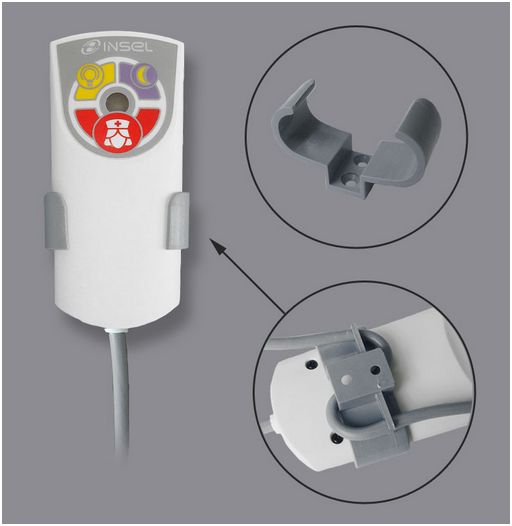 Uniwersalny uchwyt do wszystkich typów manipulatorów INSEL. Dodatkowo zabezpiecza przed wyrwaniem wtyku manipulatora z gniazda w aparatach przyłóżkowych i panelach nadłóżkowych.