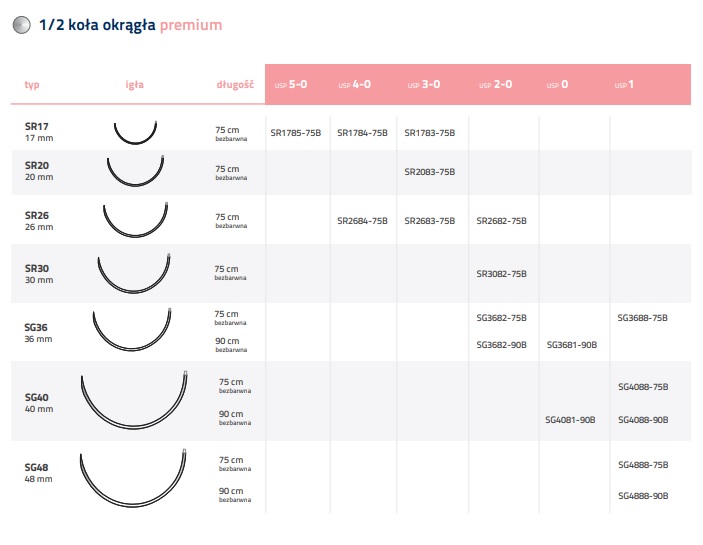 Krzywizna igły (5/8; 1/2 ; 3/8 ; 1/4; 1/8):