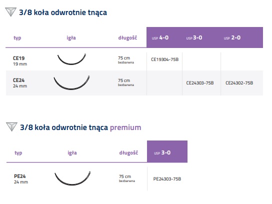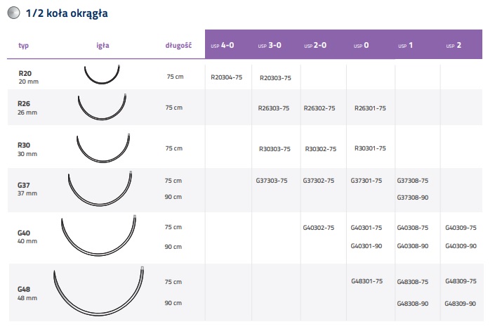 Krzywizna igły (5/8; 1/2 ; 3/8 ; 1/4; 1/8):