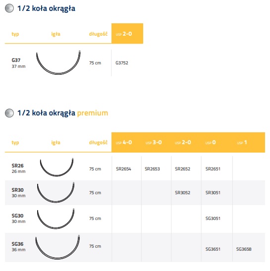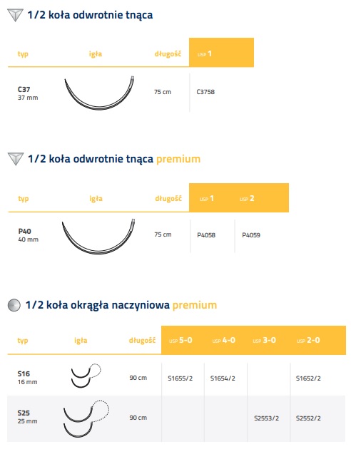 - szwy syntetyczne, niewchłanialne, plecione, powlekane,