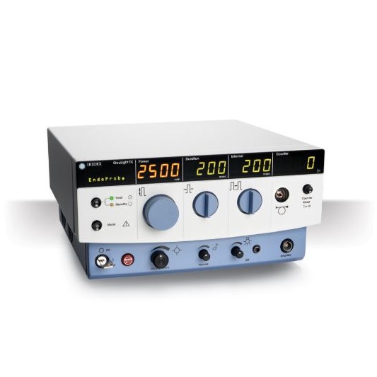 Laser IRIDEX OcuLight TX o długości fali 532nm w komplecie z lampą szczelinową CSO w układzie Zeiss z pięcioma powiększeniami 5x , 8x, 12x, 20x i 32x, adapterem z mikromanipulatorem, dodatkowym podręcznym panelem sterowania, pedałem nożnym i stolikiem SE 243. Laser ma moc na wyjściu konsoli 2,5W.