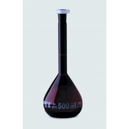 Szkło borokrzemianowe, bursztynowe. Z korkiem z PP. Zgodne z normami DIN EN ISO 1042 oraz DIN 12664-2. Oznaczenie DE-M, certyfikat serii. Oznaczenia i napisy wykonane białą emalią. Wzorcowane na wlew (TC, IN). Tolerancje zgodne ze standardami DIN ISO dla klasy A.