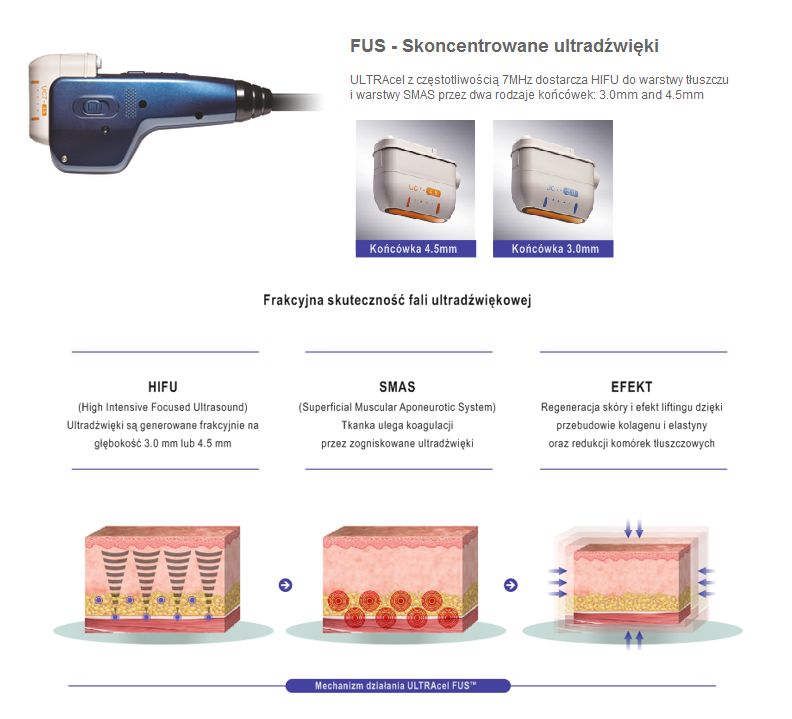 Urządzenie dostarcza prąd RF generujący w tkance ciepło, które wpływa na kolagen w głębszych warstwach skóry. Powoduje to skurczenie się głębokich warstw skóry co prowadzi do powstawania nowego kolagenu. Fale ultradźwiękowe są ogniskowane na kontrolowanej głębokości skóry gdzie energia cieplna napina warstwy tkanek aż do warstwy mięśniowej. Uszkodzenie termiczne głębokich tkanek skóry stymuluje wzrost nowego, zdrowego kolagenu powodując długotrwałe i bardziej intensywne napinanie skóry.
