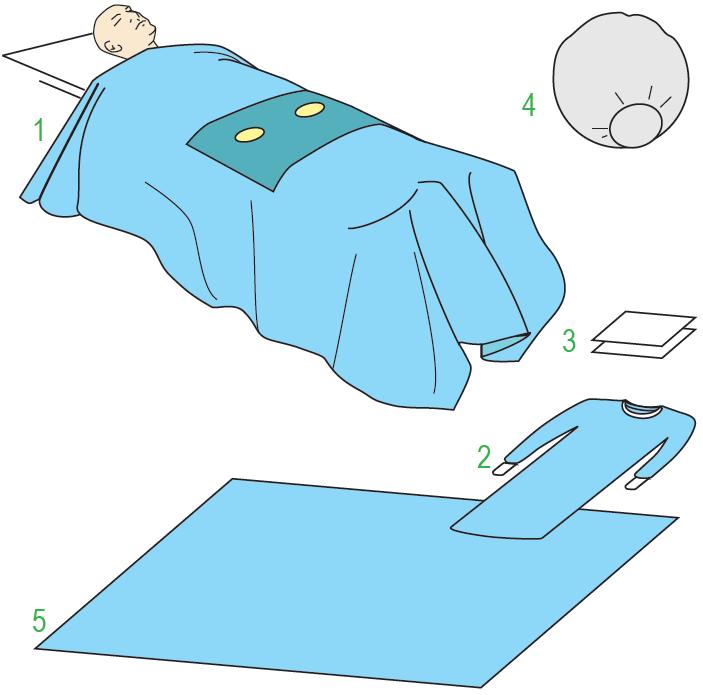 Elementy zestawu: serweta wykonana z laminatu nieprzemakalnego o wymiarach 180x300 cm, serweta posiada dwa otwory eliptyczne o wymiarach 12x15 cm wypełnione folią chirurgiczną. Otwory otoczone warstwą chłonną o wymiarach 50x80 cm - 180x300 cm - 1 sztuka; fartuch chirurgiczny wykonany z wlókniny typu SMS 30x40 cm - 2 sztuki; osłona na ekran radiologiczny O 80 cm - 1 sztuka; serweta na stolik (owinięcie zestawu) - 150x180 cm - 1 sztuka. Zestaw sterylny. Ilość sztuk w opakowaniu "podajnik": 3.