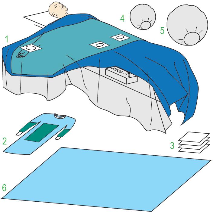 Zestaw MULTIPLEX ANGIO 230/301. Elementy zestawu: serweta wykonana z włókniny trójwarstwowej typu SMS o wymiarach 230x300 cm z przezroczystą foliową wstawką o wymiarach 70x300 cm do zabezpieczenia pulpitu sterowniczego. Serweta posiada dwa zaślepione otwory w okolicach tt. udowych (O 8,5 cm) otoczone taśmą samoprzylepną, oraz dwa zaślepione otwory eliptyczne w okolicach tt. promieniowych o wymiarach 6x12 cm otoczone taśmą samoprzylepną. Otwory otoczone warstwą chłonną o wymiarach 110x150 cm - 230x300 mm - 1 sztuka; fartuch chirurgiczny wykonany z włókniny typu SMS, posiada nieprzemakalne wstawki w przedniej części i w rękawach - rozmiar XL - 1 sztuka; ręczniki chłonne 30x40 cm - 1 sztuka; osłona na głowice RTG - O 50 cm - 1 sztuka; osłona na ekran radiologiczny - O 80 - 1 sztuka; serweta na stolik - 150x200 cm (owinięcie zestawu) - 1 sztuka. Zestaw sterylny. Ilość sztuk w opakowaniu "podajnik": 3.