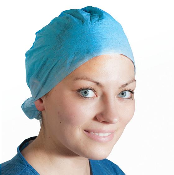 Czepek chirurgiczny o kroju furażerki, w części bocznej wykonany z włókniny pochłaniającej pot, a w części górnej z włókniny perforowanej, wiązany na troki. Pakowany w kartonik w formie podajnika. Kolor niebieski. Ilość sztuk w opakowaniu "podajnik"/Ilość sztuk w opakowaniu transportowym: 50/500. Rozmiar L.
