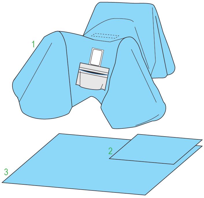 OBŁOŻENIE PERINEUM 150/2ST. Elementy zestawu: serweta chirurgiczna do zabiegów ginekologicznych dolnych o wymiarach 240/150x150 cm zintegrowana z nogawicami, posiada otwór samoprzylepny o wymiarach 10x15 cm w okolicach krocza, oraz zintegrowaną kieszeń na płyny o wymiarach 30x30 cm wyposażoną w sztywnik 240/150x150 cm - 1 sztuka; serweta chirurgiczna 75x90 cm - 1 sztuka; serweta chirurgiczna (owinięcie zestawu) 150x200 cm - 1 sztuka. Zestaw sterylny. Ilość sztuk w opakowaniu "podajnik": 7.