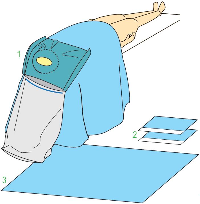 OBŁOŻENIE DO KRANIOTOMII COMPTUS. Elementy zestawu: eliptyczny wypełniony folią chirurgiczną o wymiarach 9x12 cm, wyposażona w dodatkową warstwę chłonna wokół otworu o wymiarach 50x60 cm z zakładkami oraz zintegrowany worek foliowy do przechwytywania płynów 260x180 cm - 1 sztuka; serweta chirurgiczna z taśmą samoprzylepną do zabezpieczenia headrestu 45x60 cm - 2 sztuki; serweta na stolik - (owinięcie zestawu) 150x200 xm - 1 sztuka. Zestaw sterylny. Ilość sztuk w opakowaniu typu 'podajnik': 6.