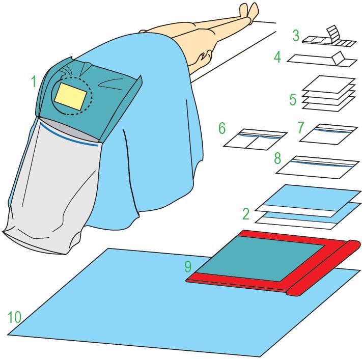 ZESTAW MULTIPLEX COMPTUS 280/240. Elementy zestawu: serweta chirurgiczna do zabiegów w okolicy głowy o wymiarach 240x180 cm posiadająca otwór wypełniony folią chirurgiczną o wymiarach 25x20 cm, wyposażona w dodatkową warstwę chłonna wokół otworu o wymiarach 50x60 cm z dwoma zakładkami oraz zintegrowany worek foliowy do przechwytywania płynów 240x180 cm - 1 sztuka; serwety chirurgiczne z taśmą samoprzylepną do zabezpieczenia headrestu 45x60 cm - 2 sztuki; taśmy samoprzylepne typu RZEP 2x23 cm - 1 sztuka; taśma samoprzylepna 9x49 cm - 1 sztuka; ręczniki chłonne 30x40 cm - 4 sztuki; kieszeń dwukomorowa samoprzylepna ze sztywnikiem 2x15x30 cm - 1 sztuka; kieszeń jednokomorowa samoprzylepna ze sztywnikiem 30x30 cm - 1 sztuka; kieszeń jednokomorowa samoprzylepna ze sztywnikiem 30x50 cm - 1 sztuka; czerwona osłona na stolik MAYO 80x145 cm - 1 sztuka; serweta na stolik - (owinięcie zestawu) 150x200 xm - 1 sztuka. Zestaw sterylny. Ilość sztuk w opakowaniu typu 'podajnik': 4.