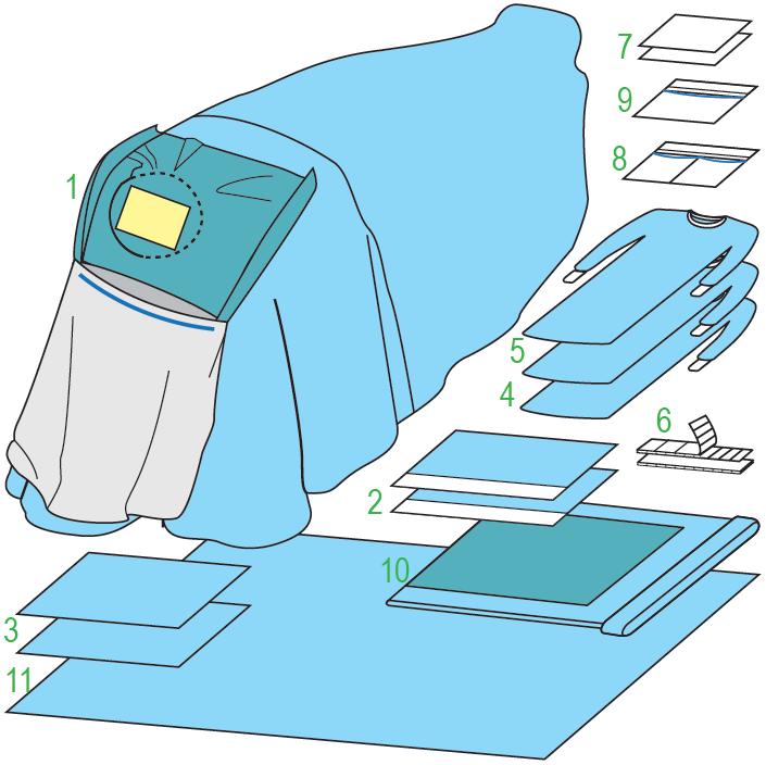 ZESTAW MULTIPLEX COMPTUS 240/350. Elementy zestawu: serweta chirurgiczna do zabiegów w okolicy głowy o wymiarach 240x350 cm posiadająca otwór wypełniony folią chirurgiczną o wymiarach 25x20 cm, wyposażona w dodatkową warstwę chłonna wokół otworu o wymiarach 50x60 cm z dwoma zakładkami oraz zintegrowany worek foliowy do przechwytywania płynów 240x350 cm - 1 sztuka; serwety chirurgiczne z taśmą samoprzylepną do zabezpieczenia headrestu 45x60 cm - 2 sztuki; serwety chirurgiczne 50x60 cm - 2 sztuki; fartuchy chirurgiczne wykonane z włókniny typu SMS XL - 2 sztuki; fartuch chirurgiczny wykonany z włókniny typu SMS L - 1 sztuka; taśmy samoprzylepne typu RZEP 2x23 cm - 2 sztuki; ręczniki chłonne 30x40 cm - 2 sztuki; kieszeń dwukomorowa samoprzylepna ze sztywnikiem 2x15x30 cm - 1 sztuka; kieszeń jednokomorowa samoprzylepna ze sztywnikiem 30x30 cm - 1 sztuka; osłona na stolik MAYO 79x145 cm - 1 sztuka; serweta na stolik - (owinięcie zestawu) 150x200 xm - 1 sztuka. Zestaw sterylny. Ilość sztuk w opakowaniu typu 'podajnik': 2.