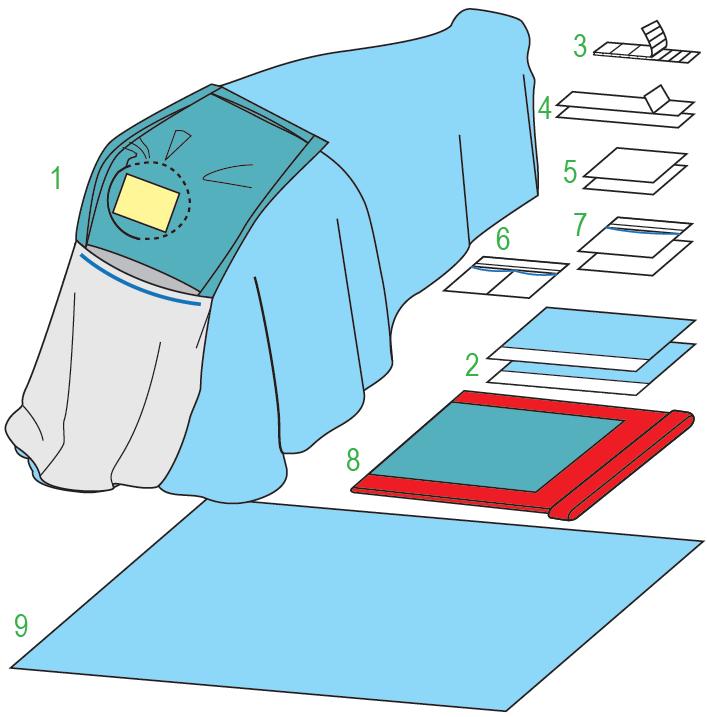 ZESTAW DO KRANIOTOMII MULTIPLEX COMPTUS. Elementy zestawu: serweta chirurgiczna do zabiegów w okolicy głowy o wymiarach 240x180 cm posiadająca otwór wypełniony folią chirurgiczną o wymiarach 25x20 cm, wyposażona w dodatkową warstwę chłonna wokół otworu o wymiarach 50x60 cm z dwoma zakładkami oraz zintegrowany worek foliowy do przechwytywania płynów 240x180 cm - 1 sztuka; serwety chirurgiczne z taśmą samoprzylepną do zabezpieczenia headrestu 45x60 cm - 2 sztuki; taśmy samoprzylepne typu RZEP 2x40 cm - 1 sztuka; taśmy samoprzylepne 9x49 cm - 2 sztuki; ręczniki chłonne 30x40 cm - 2 sztuki; kieszeń dwukomorowa samoprzylepna ze sztywnikiem 2x15x30 cm - 1 sztuka; kieszenie jednokomorowe samoprzylepne ze sztywnikiem 30x30 cm - 2 sztuka; czerwona osłona na stolik MAYO 80x145 cm - 1 sztuka; serweta na stolik - (owinięcie zestawu) 150x200 xm - 1 sztuka. Zestaw sterylny. Ilość sztuk w opakowaniu typu 'podajnik': 2.