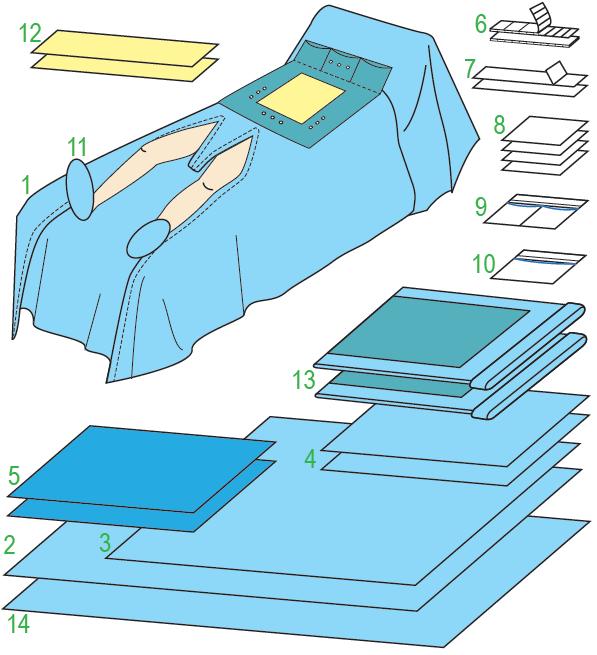 Zestaw MP CARDIO VASCULAR 201. Elementy zestawu: trójwarstwowa serweta chirurgiczna do zabiegów kardiochirurgicznych w kształcie litery T, o wymiarach 180/200x340 cm, posiadająca otwór w okolicach klatki piersiowej o wymiarach 35x40 cm wypełniony folią chirurgiczną, otoczony warstwą wysoko chłonną o wymiarach 75x60 cm z możliwością zamocowania drenów do krążenia pozaustrojowego. Serweta posiada samoprzylepną osłonę krocza - 180/200x340 cm - 1 sztuka; serweta chirurgiczna 150x200 cm - 1 sztuka; serweta chirurgiczna pod nogi 150x150 cm - 1 sztuka; serwety chirurgiczne 75x90 cm - 2 sztuki; serwety chirurgiczne SMS 75x90 cm - 2 sztuki; taśmy samoprzylepne typu RZEP 2x25 - 2 sztuki; taśmy samoprzylepne 9x49 - 2 sztuki; ręczniki chłonne 30x40 cm - 4 sztuki; kieszeń dwukomorowa samoprzylepna ze sztywnikiem 2x15x40 cm - 1 sztuka; kieszeń jednokomorowa samoprzylepna ze sztywnikiem 30x30 cm - 1 sztuka; pokrowce na stopy 2 sztuki; folie chirurgiczne na kończyny 82x25 cm - 2 sztuki; osłony na stolik MAYO 79x145 cm - 2 sztuki; serweta na stolik (owinięcie zestawu) - 150x240 cm - 1 sztuka. Zestaw sterylny. Ilość sztuk w opakowaniu "podajnik": 3.