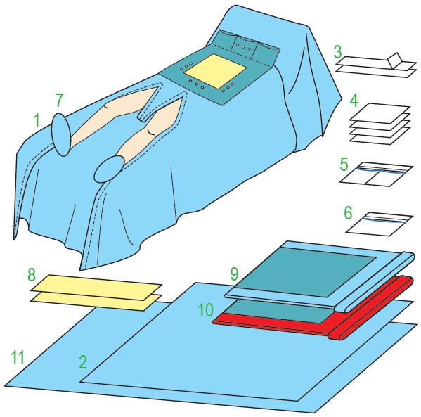 Zestaw kardiochirurgiczny. Elementy zestawu: trójwarstwowa serweta chirurgiczna do zabiegów kardiochirurgicznych w kształcie litery T, o wymiarach 180/200x340 cm, posiadająca otwór w okolicach klatki piersiowej o wymiarach 35x40 cm wypełniony folią chirurgiczną, otoczony warstwą wysoko chłonną o wymiarach 75x60 cm z możliwością zamocowania drenów do krążenia pozaustrojowego. Serweta posiada samoprzylepną osłonę krocza 180/200x340 cm - 1 sztuka; taśma samoprzylepna 9x49 - 2 sztuki; ręczniki chłonne 30x40 cm - 4 sztuki; kiszeń dwukomorowa samoprzylepna ze sztywnikiem 2x15x30 cm - 1 sztuka; kieszeń samoprzylepna jednokomorowa ze sztywnikiem 30x30 cm - 2 sztuka; pokrowce na stopy - 2 sztuki; folia chirurgiczna na kończyny 82x25 cm - 2 sztuki; osłona na stolik MAYO 80x145 cm - 1 sztuka; czerwona osłona na stolik serweta na stolik (owinięcie zestawu) - 150x240 cm - 1 sztuka. Zestaw sterylny. Ilość sztuk w opakowaniu "podajnik": 3.
