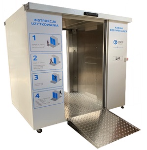 Śluza dezynfekcyjna do stosowania w miejscach użyteczności publicznej, szpitalach, biurowcach, ,galeriach handlowych, kopalniach, halach produkcyjnych i targowych, lotniskach, hotelach do zwalczania wszelkiego rodzaju wirusów odmiany COVID-19, POLIO, PTASIA GRYPA, ASF, bakterii niszczących grzyby, drożdże i pleśnie. Urządzenie jest wykonane z najwyższą starannością z wykorzystaniem wysokiej jakości materiałów. Zastosowano w nim nowoczesne rozwiązania dla bezpieczeństwa ludności, z bezdotykową detekcją osób, zakresem dezynfekcji 360o. Skuteczna atomizacja w postaci mgły środka do dezynfekcji SILVERSEPT TOTAL nieszkodliwego dla ludzi i zwierząt gwarantuje pełną dezynfekcję ludzi i sprzętu.