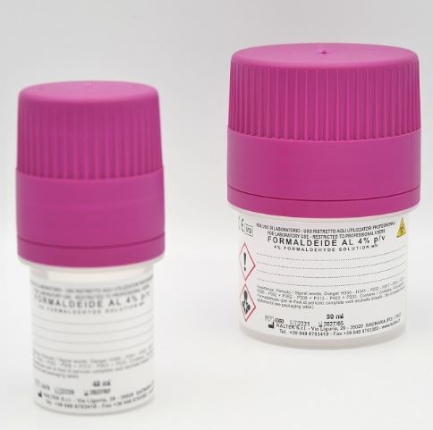 Pokrywa wypełniona substancją utrwalającą o stężeniu formaldehydu 4% (10% roztwór formaliny). w ilości 90 ml. Uwalnianie formaliny poprzez innowacyjny system w momencie zakręcania pojemnika po umieszczeniu w nim materiału tkankowego. Zaproponowana konstrukcja pojemnika w pełni zabezpieczająca biopsyjny materiał tkankowy oraz zapewniająca właściwe utrwalenie materiału tkankowego.