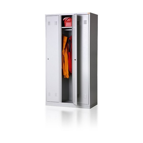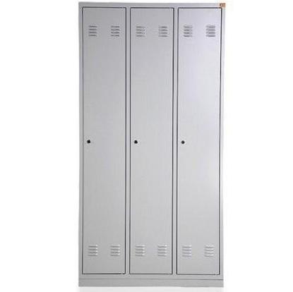 Trzydrzwiowa szafa ubraniowa wyposażona jest w półkę, wieszaki boczne oraz drążek na wieszaki ubraniowe. Wykonana jest z blachy czarnej o grubości 0.6mm-1.0mm, malowana farbami proszkowymi (epoksydowo- poliestrowymi). Zamykana zamkiem krzywkowym w systemie MASTER KEY . Całość osadzona na cokole wykonanym z blachy ocynkowanej (malowanej) o grubości 1.0mm.