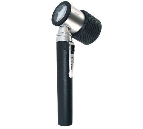Dermatoskop halogenowy z jedną żarówką halogenową powiększeniem 10x krotnym i szkłem kontaktowym 2,5 mm. Powiększenie w zakresie -6 do 3.5 dioptrii. Szkło imersyjne z podziałką. W zestawie trwałe etui na rzep. Brak baterii w komplecie. Rękojeść typu AA plastikowa.