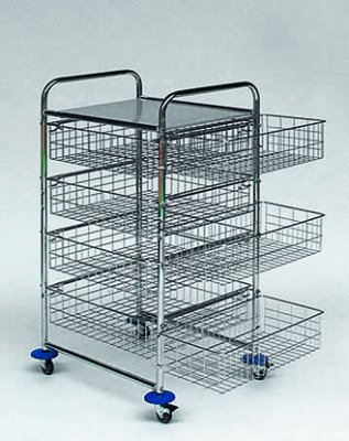 Wózek ambulatoryjny z 1 półką i 4 koszami (szufladami) w postaci stalowej "siatki", na stelażu. Liczba i rozmiary koszy (szuflad) może być wybrana w zależności od potrzeb.