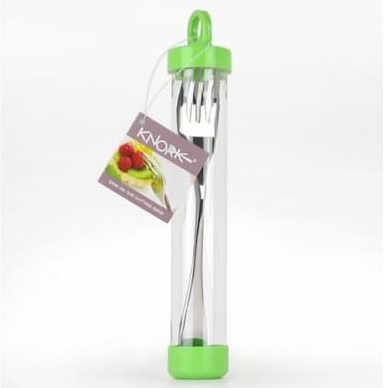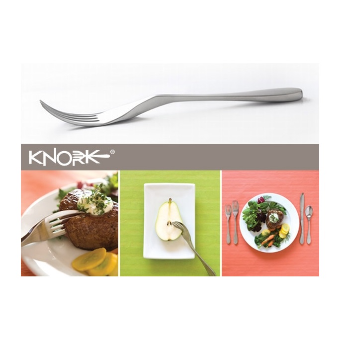 Widelconóż firmy Knork to widelec z ergonomicznym brzegiem, który pozwala na cięcie żywności za pomocą prostego ruchu kołysania. Zewnętrzny fazowany brzeg zapewnia bardzo skuteczne cięcie, a jednocześnie w ogóle nie jest ostry dlatego widelec nie porani jamy ustnej.