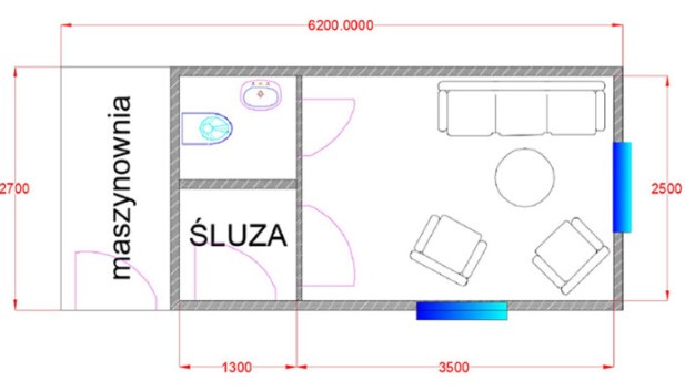 • Gabinet „Kapsuła Natury” wymiary zewnętrzne szerokość 2700 mm, wysokość od podłogi 2650 mm, długość 6200 mm