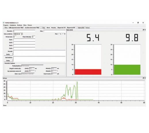 Dzięki Leg Force Feedback mamy możliwość izometrycznego pomiaru siły prostowników i zginaczy kończyn dolnych. Pomiary i rehabilitacja – ćwiczenia odbywają się przy różnym kącie zgięcia w stawie z wykorzystaniem Biofeedbacku (biologicznego sprzężenia zwrotnego) w postaci wizualizacji liczbowej (i wizualizacji wykresów w czasie rzeczywistym) oraz sterowania grami komputerowymi.