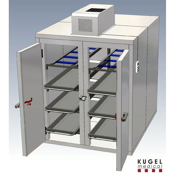 Podwójna komora chłodnicza do przechowywania 8 ciał na czterech poziomach. Stabilne, samonośne elementy ścian, podłogi i sufitu z płyt warstwowych. Wykonana ze stali nierdzewnej ANSI 304 (alternatywna opcja ze stali ocynkowanej, malowanej proszkowo). Szczelne drzwi z obwodową uszczelką profilowaną. Możliwość zamontowania indywidualnych drzwi dla każdego ciała. Tace na ciała (również na ciała bariatryczne). Moduły chłodzące typu monoblock lub split do pracy jako chłodnia lub mroźnia. Możliwość wyposażenia w automatyczny przełącznik redundantny zapewniający naprzemienną pracę jednostek chłodzących w trybie 24-godzinnym (przy wyborze dwóch agregatów) wydłużający żywotność i zabezpieczający na ewentualność awarii jednej z jednostek.