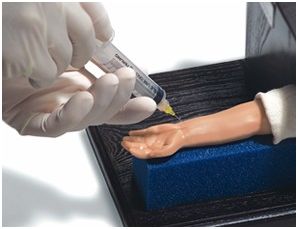 Realistycznie odtworzone ramię noworodka ze strukturą kostną pozwalające opanować technikę nakłuć tętnicy promieniowej noworodków.