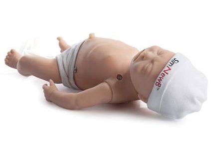 SimNewB to interaktywny symulator zaprojektowany przez firmę Laerdal we współpracy z Amerykańską Akademią Pediatrii, spełniający wymagania wynikające z zasad opieki medycznej nad noworodkami w sytuacjach krytycznych oraz potrzeb szkolenia resuscytacyjnego. Realistyczne odtworzenie cech anatomicznych noworodka i precyzyjna symulacja naturalnych reakcji jego organizmu czynią SimNewB doskonałym instrumentem mogącym sprostać szczególnym wyzwaniom towarzyszącym przekazywaniu umiejętności wykonywania zabiegów resuscytacyjnych u noworodków. Właściwości symulatora SimNewB: 1. realistyczna anatomia – manekin SimNewB stanowi wierne odtworzenie wyglądu w pełni donoszonego noworodka płci żeńskiej, o wzroście 53 cm i wadze 3,2 kg 2. możliwość wyboru jednego z sześciu poziomów aktywności pacjenta: symulator może naśladować ruchy i płacz silnego, zdrowego noworodka, wykazywać cechy dziecka upośledzonego, słabego, sinicznego, aż do noworodka bez żadnych objawów czynności życiowych 3. realistyczne drogi oddechowe i symulacja funkcji oddechowych: • możliwość szkolenia w zakresie wszystkich zabiegów wykonywanych na drogach oddechowych noworodka, łącznie ze stosowaniem masek krtaniowych, rurek dotchawicznych i urządzeń wspierających oddychanie, • zmienny stopień podatności płuc – możliwość nabycia większej wprawy w wykrywaniu i leczeniu zmian, • realistyczna symulacja unoszenia się klatki piersiowej - klatka piersiowa może unosić się z częstością do 100 oddechów na minutę lub nie unosić się wcale, • obustronne lub jednostronne unoszenie się klatki piersiowej podczas mechanicznej wentylacji, • wydychanie CO2, • możliwość mierzenia saturacji tlenowej [tylko wersja SimNewB Advanced], • możliwość symulacji odmy opłucnowej (jednostronne unoszenie się klatki piersiowej z mechaniczną wentylacją, jednostronne dźwięki oddechowe) i jej odbarczania za pomocą punkcji igłowej, • możliwość treningu rękoczynu Sellick'a, • możliwość treningu odsysania, • możliwość zakładania sondy żołądkowej. 4. drożny pępek charakteryzujący się realistycznie symulowanym tętnem i możliwością założenia cewnika pępowinowego 5. tętno mierzone na ramieniu oraz na pępowinie 6. możliwość mierzenia ciśnienia (ręcznie oraz za pomocą osłuchiwania dźwięków Korotkoffa) 7. bogata biblioteka rytmów EKG pomiędzy 10 a 300 razy na minutę 8. 3-odprowadzeniowe EKG 9. możliwość wkłuć doszpikowych 10. możliwość symulowania dźwięków: • płuc (normalny, świst, zapalenie płuc i inne), • serca (normalny, szmer sercowy rozkurczowy, szmer sercowy skurczowy i inne), • wokalnych (płacz, czkawka, mruczenie i inne). 11. wymienne źrenice (normalne, rozszerzone i zwężone). 12. możliwość poruszania wszystkimi czterema kończynami i symulacji ich stanu (bezwładne, napięte, ruchy spontaniczne, napad padaczkowy). Konstrukcja symulatora pozwala łatwo wykorzystać go do realizacji każdego programu szkolenia w zakresie opieki medycznej nad noworodkami. Nowatorski interfejs użytkownika i sposób konstruowania scenariuszy dają instruktorom możliwość kontrolowania reakcji symulatora w trakcie całej sesji szkoleniowej za pomocą przycisków pilota. Wersja SimNewB Advanced posiada ponadto: 1. łatwy w obsłudze program oparty na sprawdzonym oprogramowaniu symulatorów SimMan/SimBaby 2. ręczną regulację wszystkich parametrów 3. możliwość tworzenia własnych scenariuszy zdarzeń 4. możliwość rejestracji zdarzeń za pomocą kamery wideo 5. możliwość przeglądu rejestrów zdarzeń prezentowanych synchronicznie z zapisami z monitora pacjenta i obrazami z umieszczonej w pomieszczeniu kamery wideo 6. możliwość przeglądania raportów poza miejscem ćwiczeń 7. monitor pacjenta z ekranem dotykowym i wielostopniowym alarmem umożliwiający monitorowanie takich parametrów jak: tętno, EKG, SPO2, NBP, ETCO2, współczynnik oddechowy.