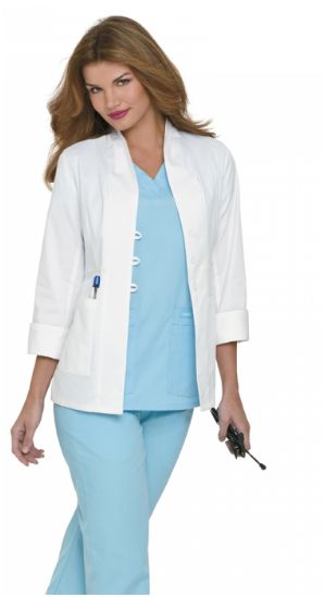 Inspirowany Azją, nowoczesny, szykowny fartuch laboratoryjny. Trzy guziki zapinane na pętelki. Kołnierzyk szalowy. Dwie duże nakładane kieszenie oraz jedna małą kieszonka na akcesoria. Z przodu i z tyłu modelujące zaszewki na wysokości talii. Szeroki, łatwy do wywinięcia mankiet. Boczne wycięcia mankietu o długości 3”.
