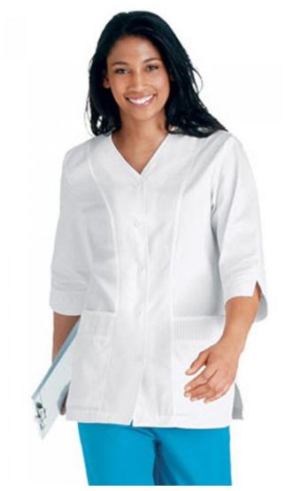 Rozpinany fartuch z królewskim szwem oraz rękawami o długości 3/4 i nacinanymi mankietami. Zapięcie na 5 guzików. Dwie dolne kieszenie z akcentem plisowanym. Szew królewski na plecach z łączeniem po środku.