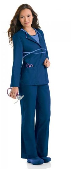Ciepły i lekki żakiet można go nosić cały rok. Kontrastujący wycinany dekolt. Ukryte zapięcie frontowe na napy. Wykończenia z pasków oraz trzy kieszenie z podziałką na długopisy.