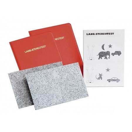 Stereo test Lang został stworzony w celu ułatwienia badania widzenia przestrzennego. Oparty jest na dwóch podstawowych zasadach: stereopsji punktów przypadkowych oraz druku mikro-cylindrycznego. Dla dzieci od 12 miesięcy, do użytku bez okularów.