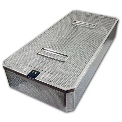 Stalowy pojemnik perforowany do sterylizacji i przechowywania narzędzi oraz optyk.