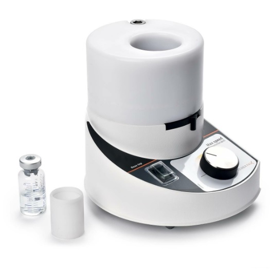 Dzięki okrężnemu ruchowi wibracyjnemu typu vortex, kontrolowanemu za pomocą pokrętła regulacji prędkości [2], prędkość można zmieniać w bardzo szerokim zakresie od 100 do 2500 obrotów na minutę przy zasilaniu 230 V lub 115 V. Jest bardzo prosty w obsłudze i gotowy do użycia po naciśnięciu przycisku zasilania [3]. Aby pomóc użytkownikowi, dostarczana jest skala z punktami odniesienia [4], aby wybrać zalecaną wartość zadaną obrotów.