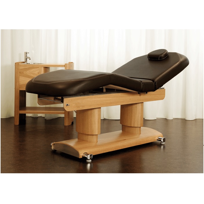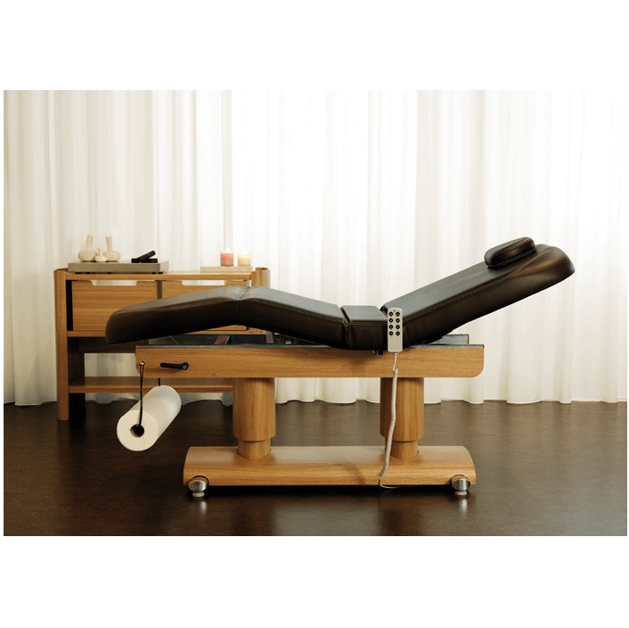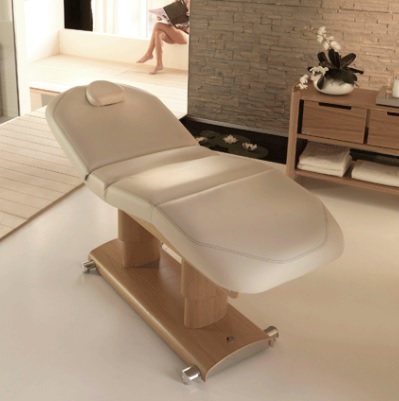 Fotel kosmetyczny charakteryzujący się funkcjonalnością i nowoczesnym wyglądem. Wysoka jakość detali optymalnie współgra ze specjalistyczną technologią, kombinacja chromowanej stali współgra ze spokojnym, ciepłym drewnem. Wysokość fotela jest regulowana elektrycznie. Komfort, wygoda i ergonomiczny kształt są rezultatem innowacyjnego i eleganckiego projektu.