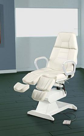 - Elektryczny fotel podologiczny z regulacją wysokości, oparcia, trendelenburg i podnóżków