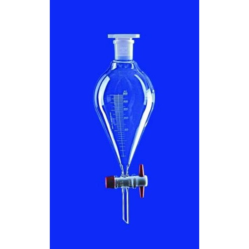 Kształt stożkowy. Ze szklanym kurkiem z głowicą z PTFE oraz blokadą kurka. Dostępne z podziałką lub bez. Z korkiem wykonanym z PP.