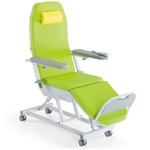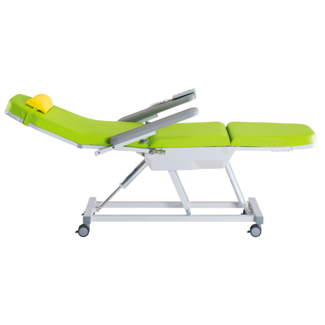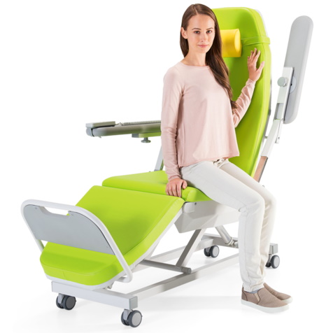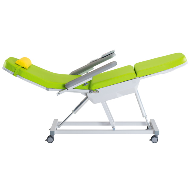SALSA® A4 to najbardziej funkcjonalny fotel zabiegowy wykorzystywany w procesach chemioterapii, podawania cytostatyków, wykonywania dializy oraz transfuzji krwi z linii SALSA® . Fotel wyposażony jest w regulowany mechanicznie podnóżek oraz wygodne podłokietniki, które można odchylać i składać do góry. Anatomicznie wyporofilowane leże zapobiega zsunięciu się pacjeta z fotela podaczas zabiegów w pozycji leżacej. Cztery silniki elektryczne zapewniają regulację części oparcia, siedziska, nóg i wysokości. Przewodowy pilot sterujący, z funckją blokady magnetycznej, posiada oddzielne przyciski, za pomocą których uzyskujemy pozycję fotelową oraz pozycje szokową lub Trendelenburga. Fotel SALSA® A4 to fotel szyty na miarę komfortu i bezpieczeństwa.