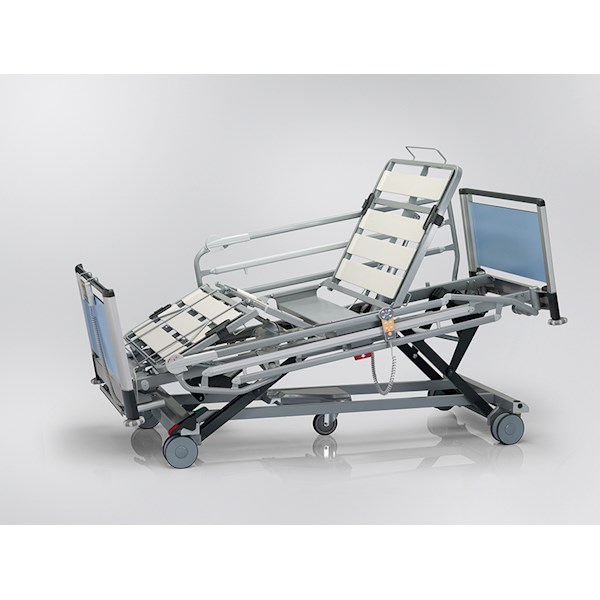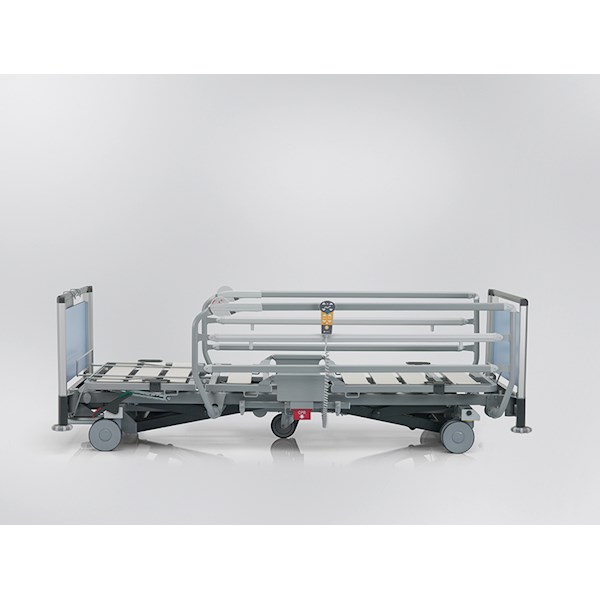 - Barierki boczne z możliwością ich podwyższenia (opcja) w celu korzystania z wysokich materacy aktywnych stosowanych w profilaktyce i leczeniu odleżyn