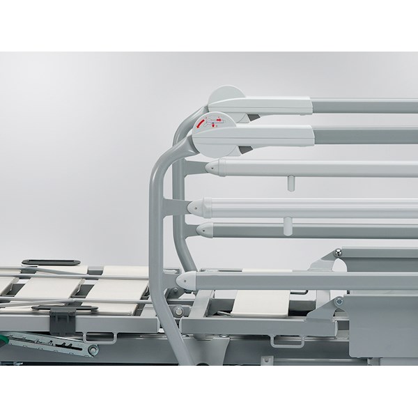 - Barierki boczne zgodne z normą bezpieczeństwa EN 60601-2-52, składane wzdłuż ramy leża, z możliwością ochrony na całej długości dzięki zastosowaniu protektora (opcja).