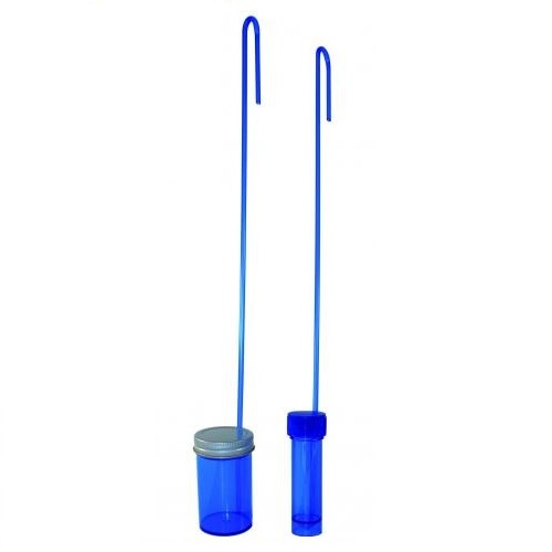 Niebieski pojemnik na próbki z zakrywką PP (30 ml) lub metalową z uszczelką PVC (100 mL, 250 mL).